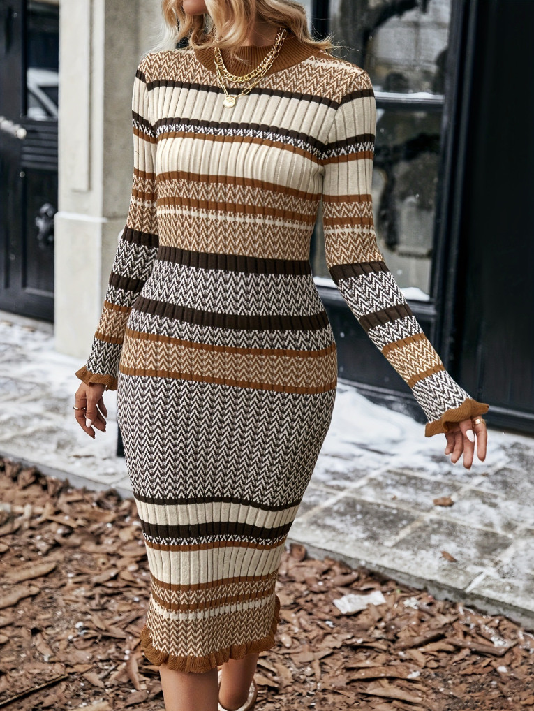 With its long sleeves, fitted silhouette, and midi length, this dress is perfect for cooler days, dinners out, or everyday outfits where you want to look polished with minimal effort. The warm neutral tones create a flattering color mix that suits every skin tone and pairs easily with boots or a simple coat.