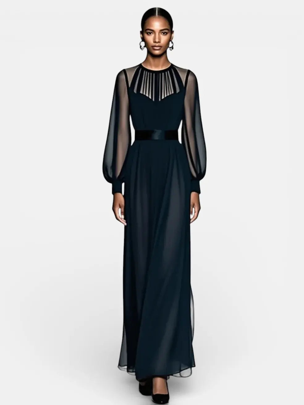 This Jules™ Elegant Dress blends modern sophistication with timeless grace. Its sheer long sleeves, delicately pleated neckline, and fluid chiffon silhouette create a look that moves with effortless refinement, making it perfect for evening events and elegant occasions.